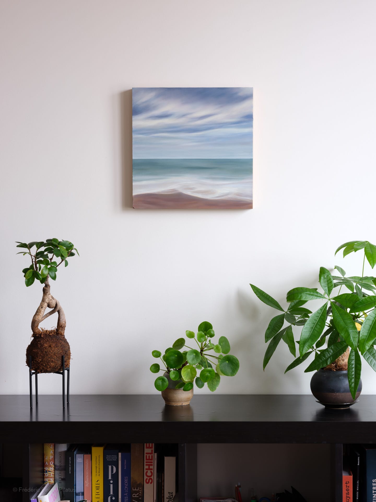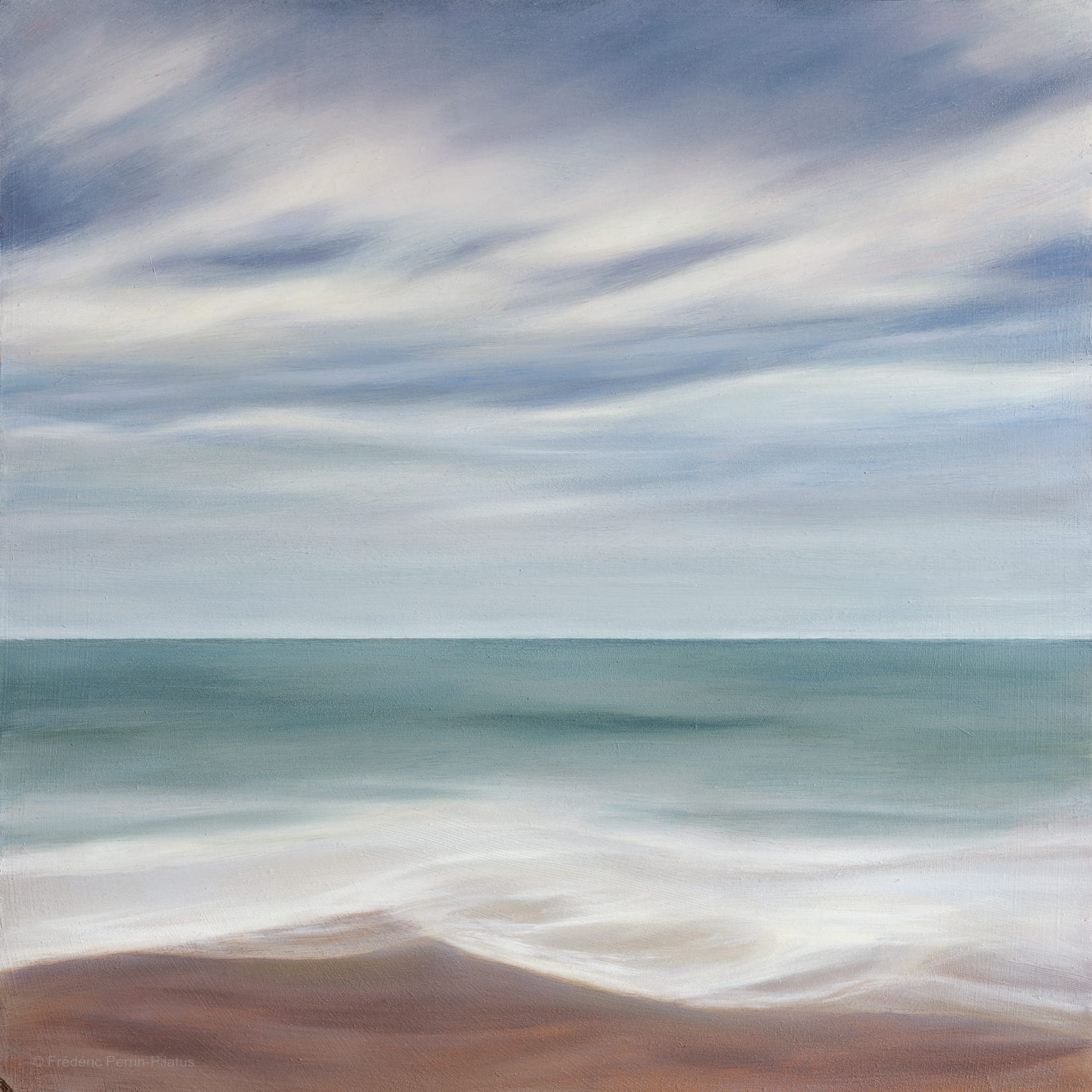 This is a work from my Landscapes, dimensions series, in oil on wood. I call it Silvery atmosphere, in reference to the unique light on the Isle of Eigg, Scotland, which inspired this work. A light that sometimes filters through the clouds like a silvery sparkle. My long exposure photography work guided me in creating this painting.