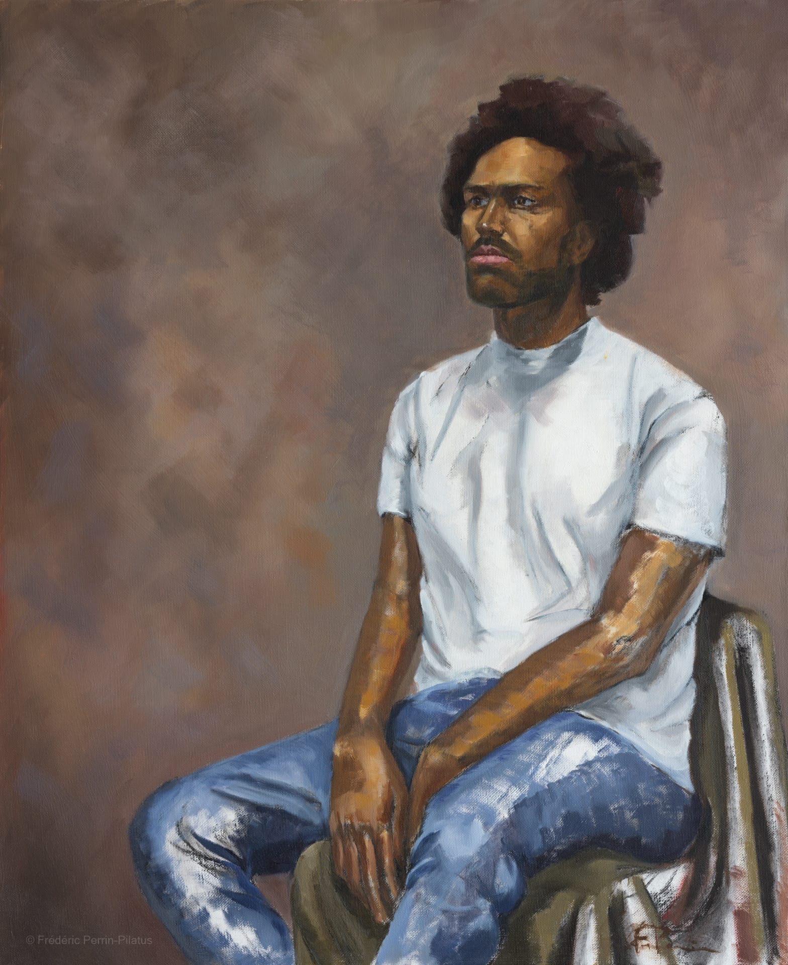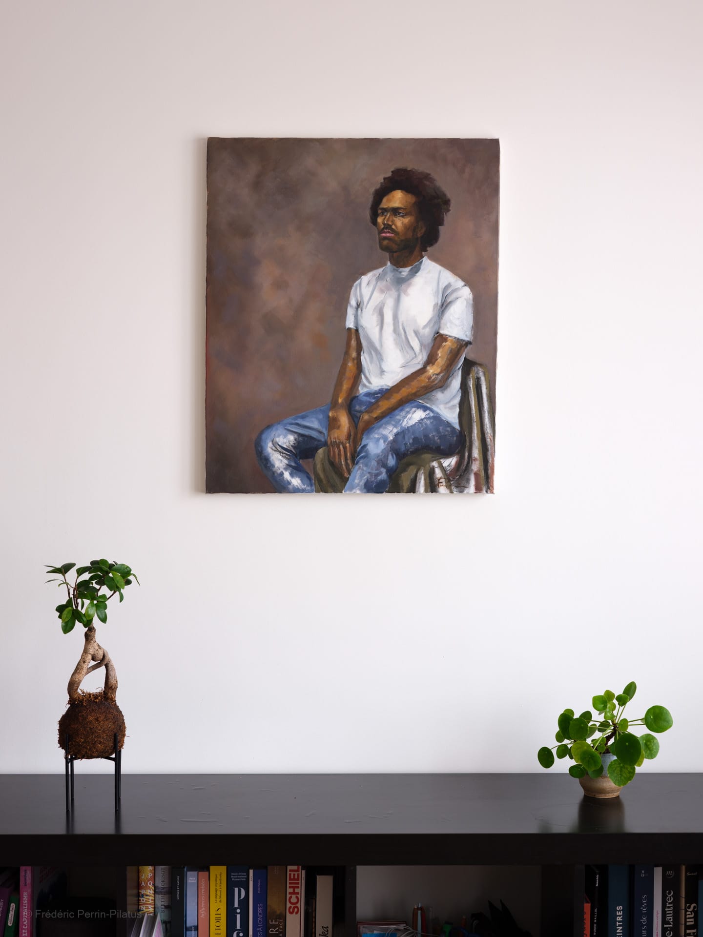 J’avais hésité à faire un portrait du modèle centré sur son visage, mais j’ai beaucoup aimé son attitude générale. Après une mise en place au fusain, j’ai utilisé la palette de Zorn (palette des classiques) pour cette toile : noir d’ivoire, carmin d’alizarine, rouge de cadmium clair, ocre jaune, blanc. Complété d’un bleu de cobalt pour la teinte si spécifique du jean.