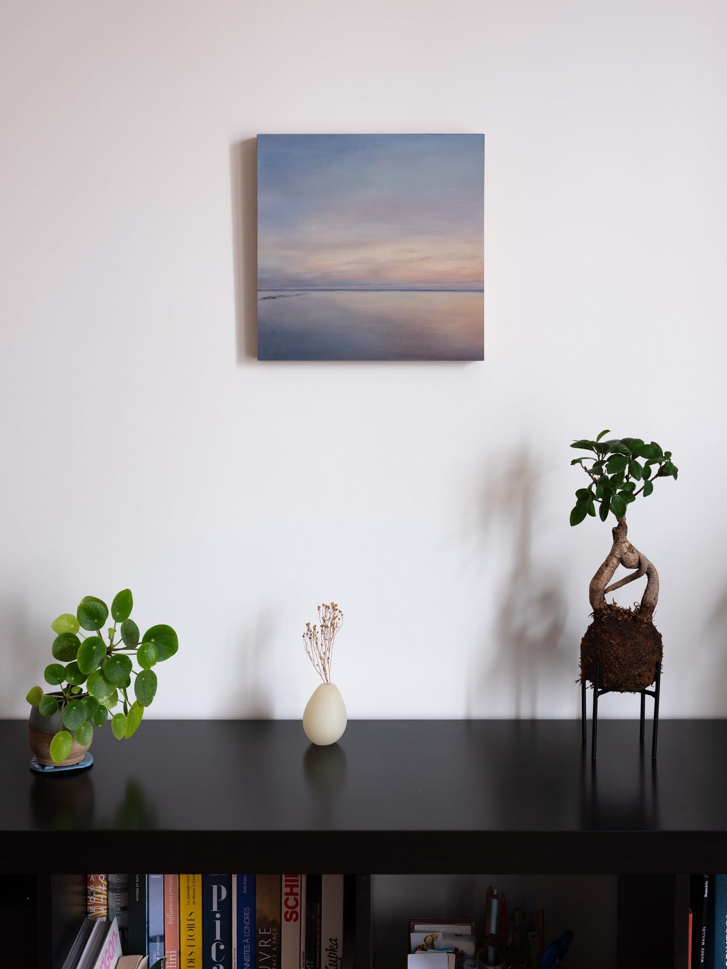 Dans ma série Paysages, dimensions, en huile sur bois, cette œuvre s’intitule Horizons variés. Une soirée d’été dans les environs de la Bernerie-en-Retz m’a servi d’inspiration pour ce paysage. C’est la première de mes explorations autour du paysage en petit format, en peinture à l’huile sur support bois.