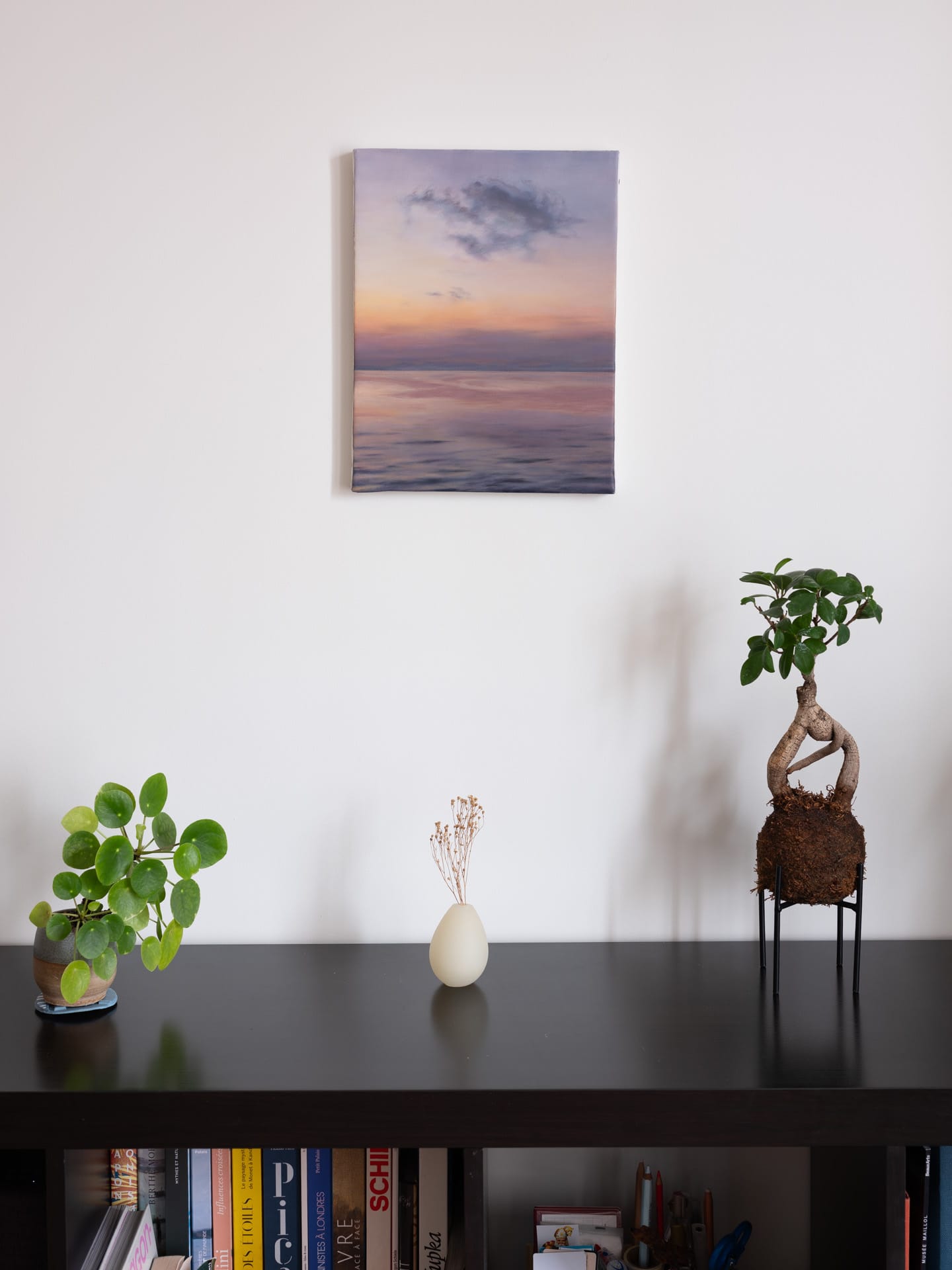Voici une toile de ma série Paysages, dimensions. Une recherche autour du paysage et de la dimension particulière apportée par le travail approfondi de la couleur, en peinture à l’huile, sur des petits formats. C’est une série que je conçois comme un cheminement vers mes paysages introspectifs et spirituels.