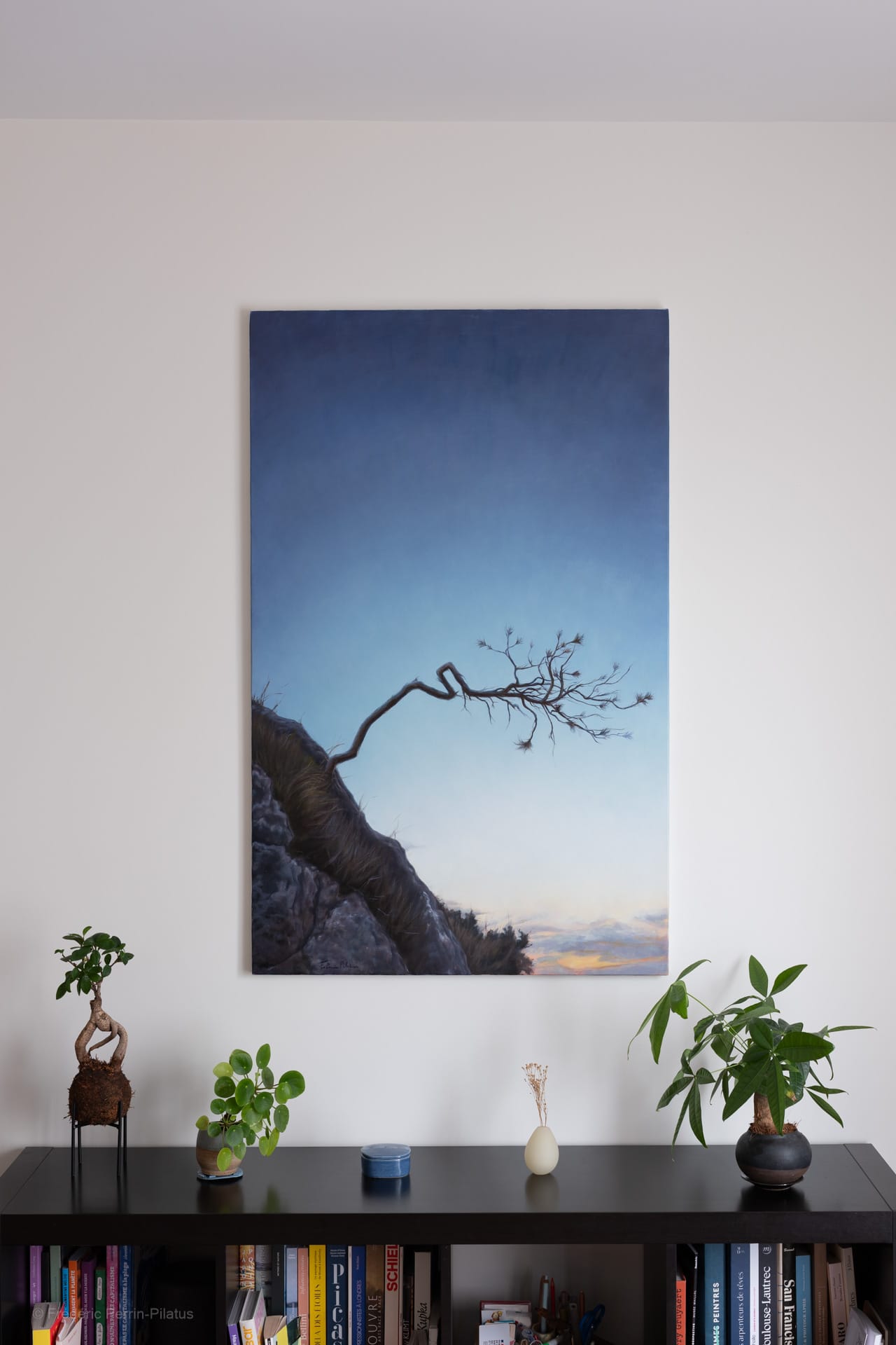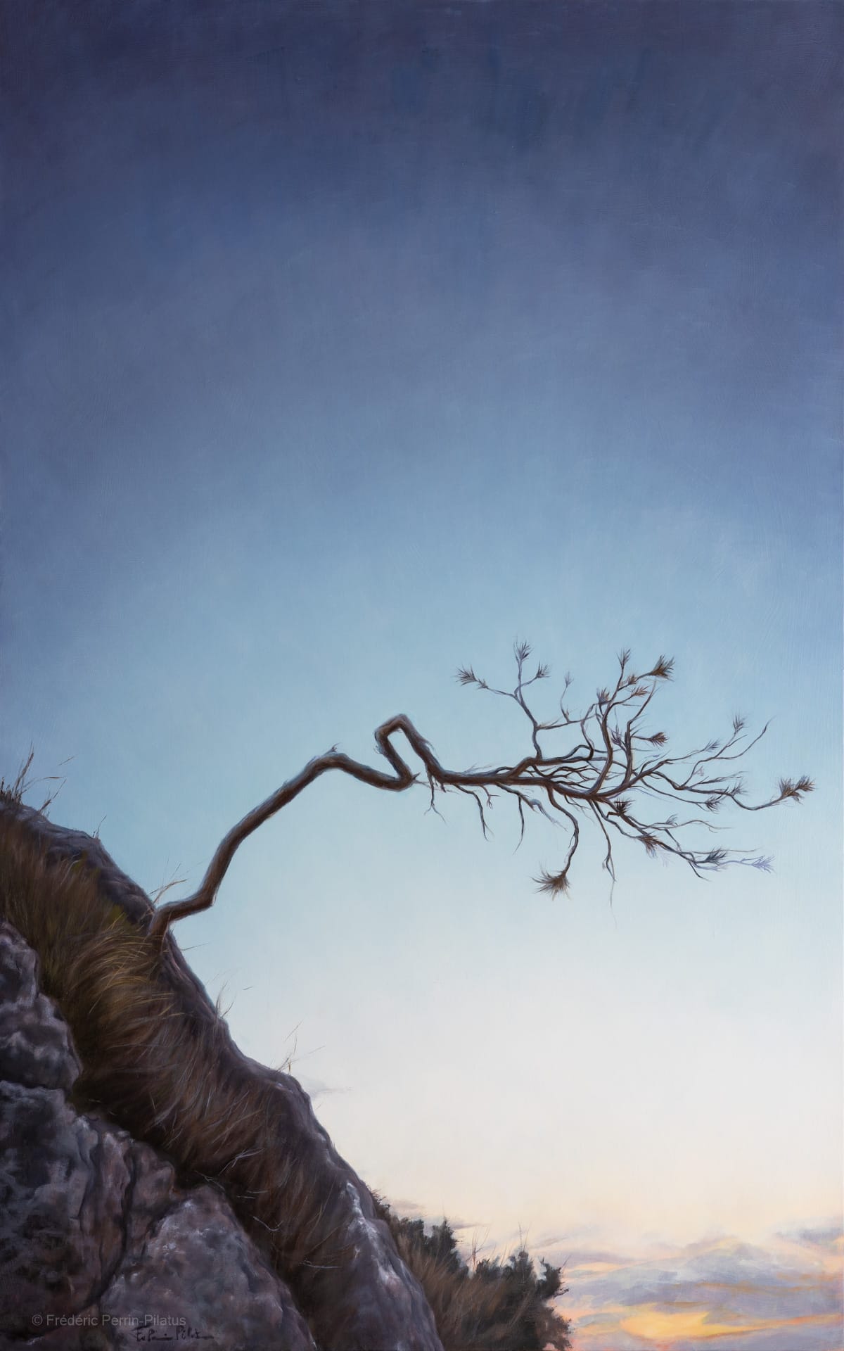 Pour la création de cette œuvre, j’ai utilisé comme modèles des photographies que j’ai prises en Écosse, en mai 2018, au Loch Maree, par un soir de printemps. Le ciel était étonnamment dégagé, et j’y ai réalisé certaines des images de ma série des portraits d’arbres. En contrebas des rives escarpées, j’entendais des saumons tourner dans l’eau, contournant un gros rocher, en une sorte de clapotis doux et continu. Représenté vers le centre de ma toile, cet arbre avait réellement ce petit décrochement, je ne l’ai pas inventé pour les besoins de ma peinture – la question m’a été posée ! L’arbre est un pin sylvestre (Pinus sylvestris) des forêts de conifères calédoniennes, une espèce endémique de cette région, issue des anciennes forêts primaires.