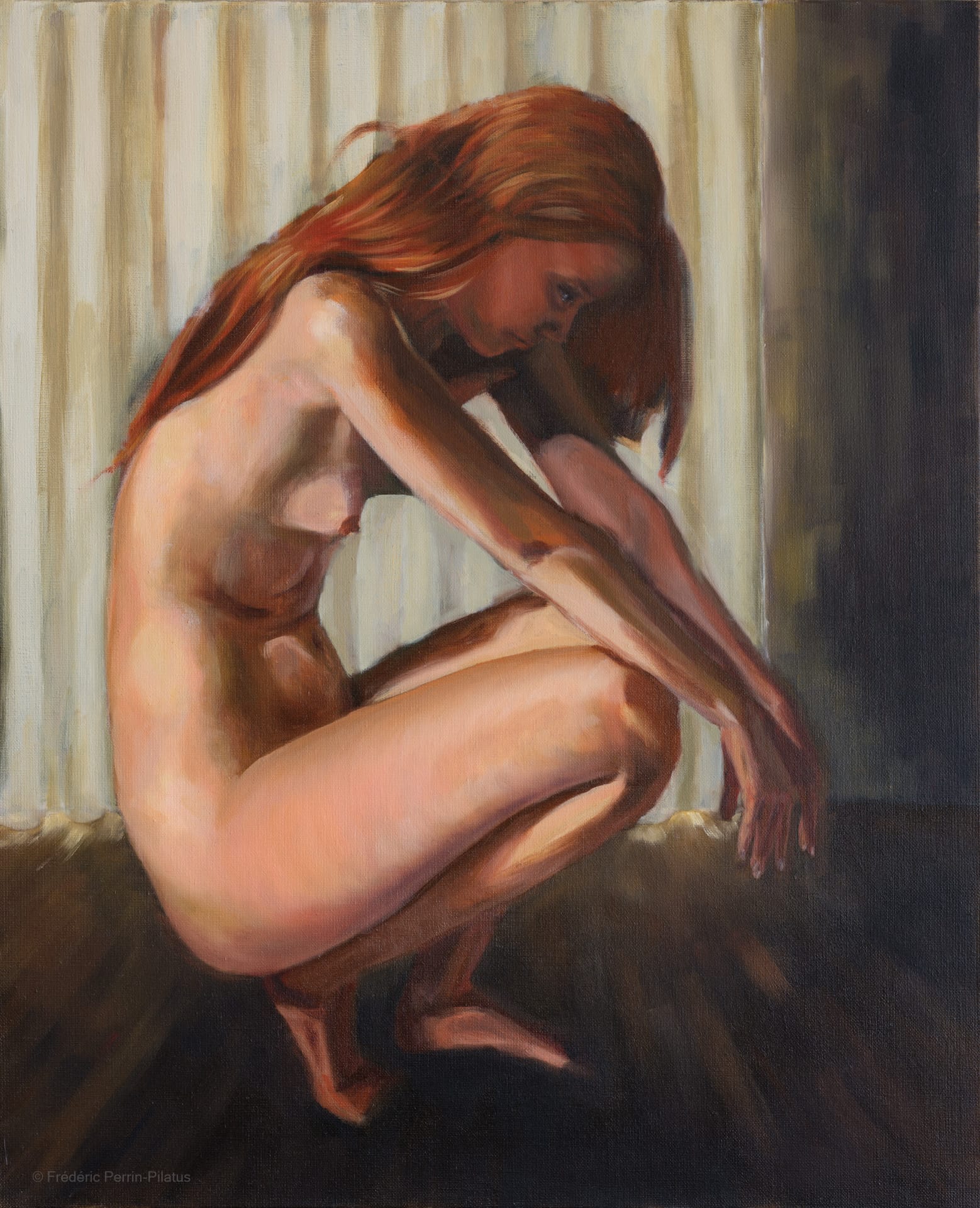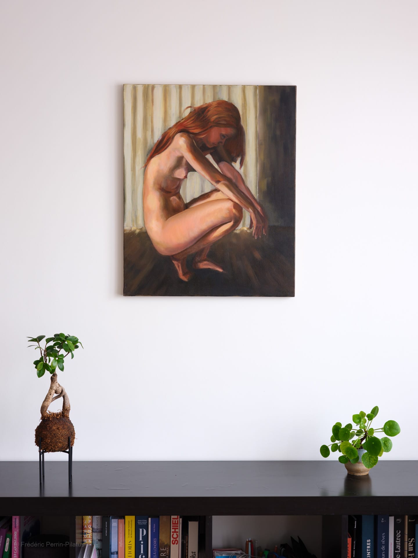 L’une de mes toiles sur l’expression des émotions au travers du corps et des visages. Je travaille en palette de Zorn (palette des classiques) pour cette toile : noir d’ivoire, carmin d’alizarine, rouge de cadmium clair, ocre jaune, blanc.