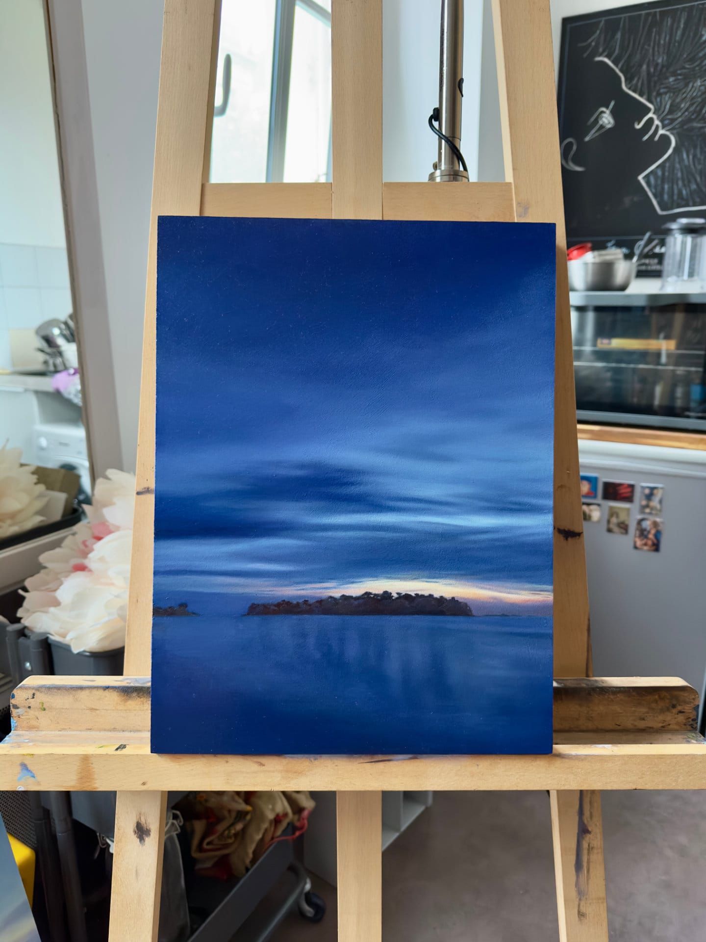 Voici une œuvre de ma série Paysages, dimensions.que j’ai finalisée en octobre 2025. C’est une peinture à l’huile sur support bois. Mes inspirations pour cette peinture ont été mes prises de vues photographiques dans le Golfe du Morbihan, en Bretagne. Et ce sont des réflexions sur les cycles de vie et de mort que j’avais en tête lors de sa création, d’où son titre Palingénésie – le processus d’où quelque chose renaît après une disparition ou une destruction, un cycle dont la fin devient le point de départ d’une nouvelle existence.