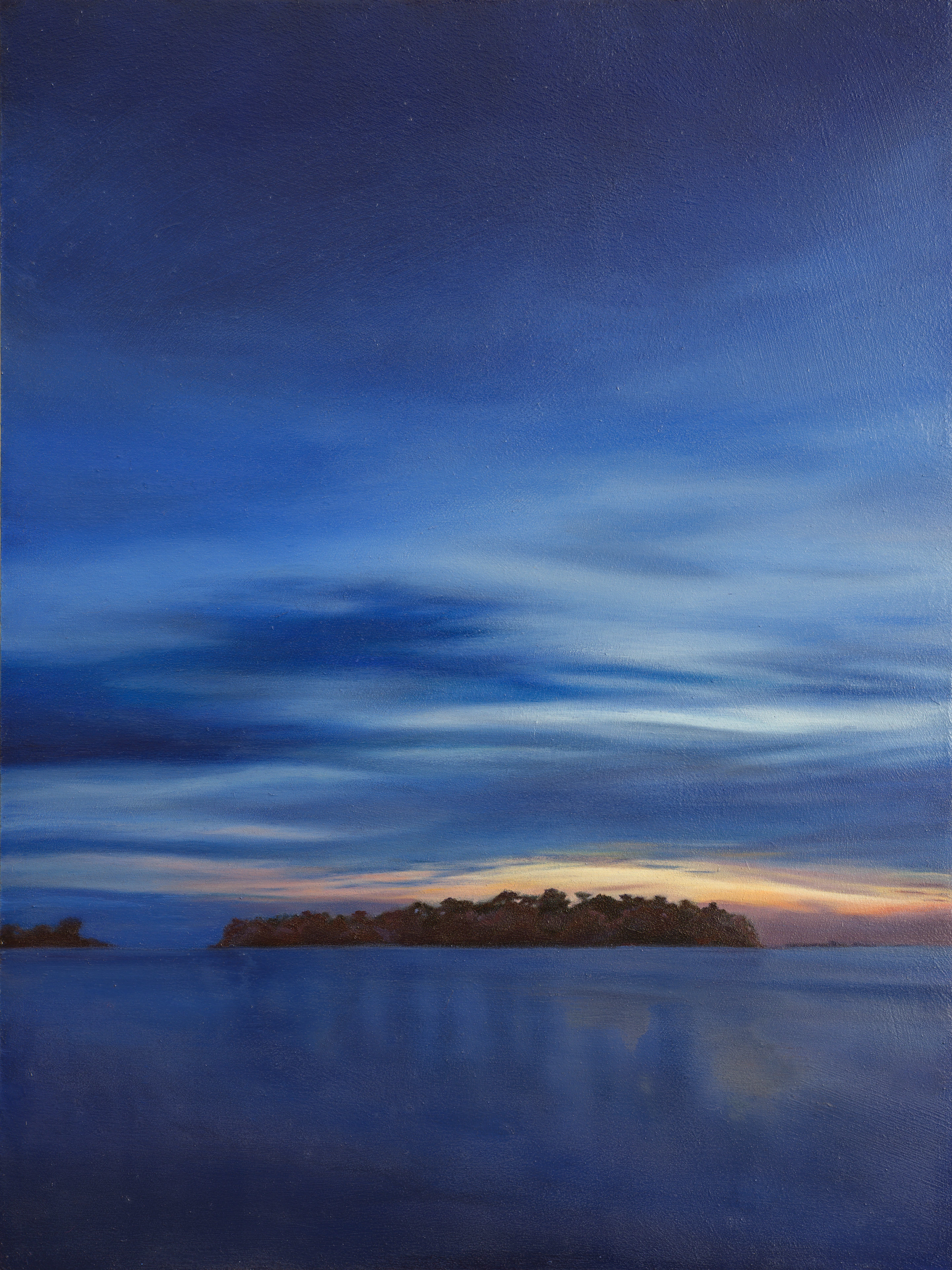 Here is a work from my Landscapes, dimensions series. This is an oil painting on wood I completed in October 2025. My inspiration for this painting came from photographs I took in the Gulf of Morbihan in Brittany. I had in mind reflections on the cycles of life and death when I created it, hence its title Palingenesis – the process by which something is reborn after disappearance or