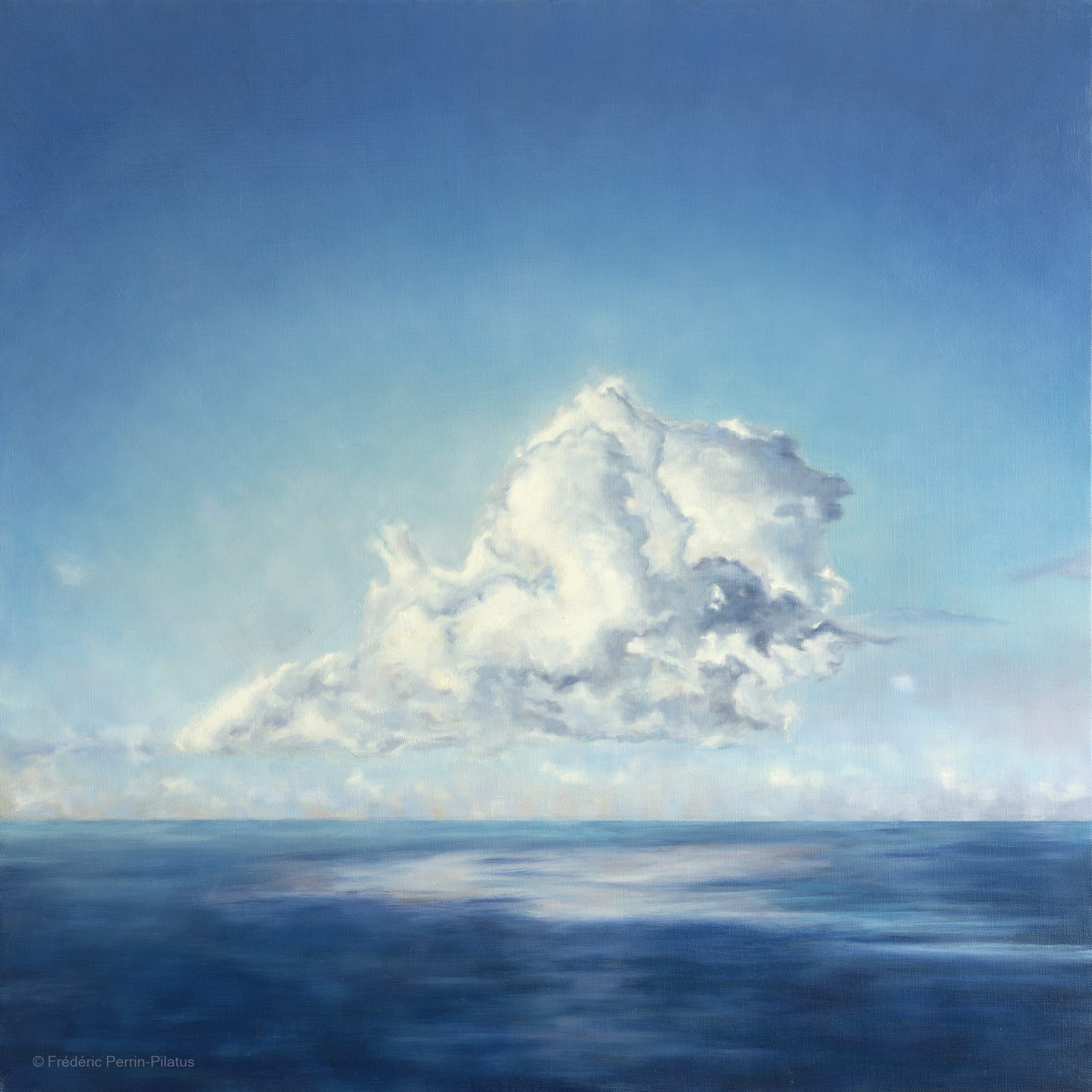 Une toile dont j’ai puisé l’inspiration lors de mon voyage aux Açores, en septembre 2022. J’y ai réalisé une série de photographies de nuages au dessus de la mer, à l’horizon. J’ai publié certaines de ces photographies sur mon site dédié à mes photographies. Mes photographies m’ont servi de modèles pour la création de cette toile, ainsi que mes souvenirs de ce moment. Une œuvre que je voulais amener vers ma série sur le paysage mystique. Cette toile représente un symbole dans mon évolution artistique : elle est à la croisée de mes recherches sur la mémoire, les émotions ; un accès spirituel par la nature et le paysage. Le mieux est de la voir en vrai : elle donne l’impression de scintiller et d’émettre sa propre lumière dans la pénombre. C’est aussi le bonheur du travail en glacis et couches fines en peinture à l’huile.